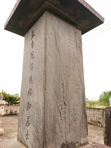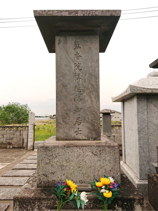 墓碑の表面には、法名「藍香院惇徳格知居士」と刻まれています。
